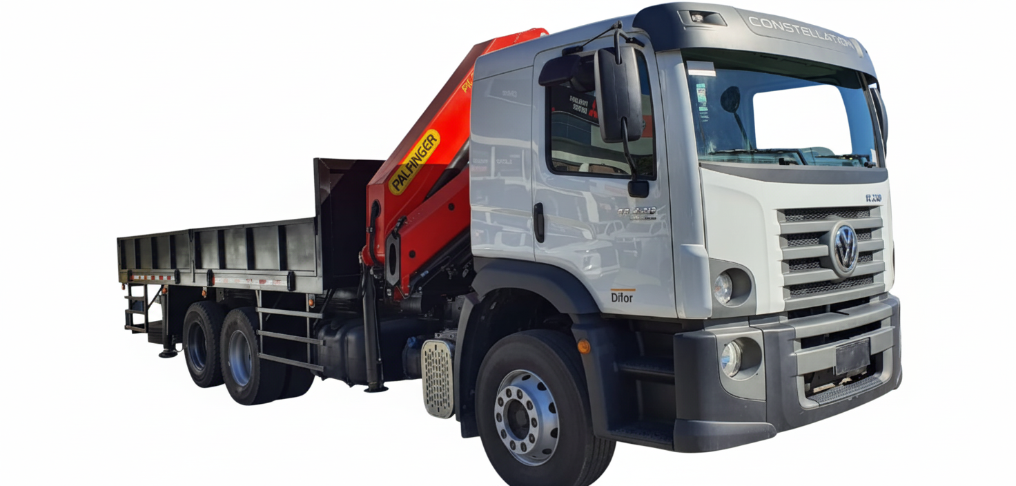 Volkswagen Constellation 17.330 con pluma 4.5 toneladas, seguro y eficiente para cargas y montajes industriales.